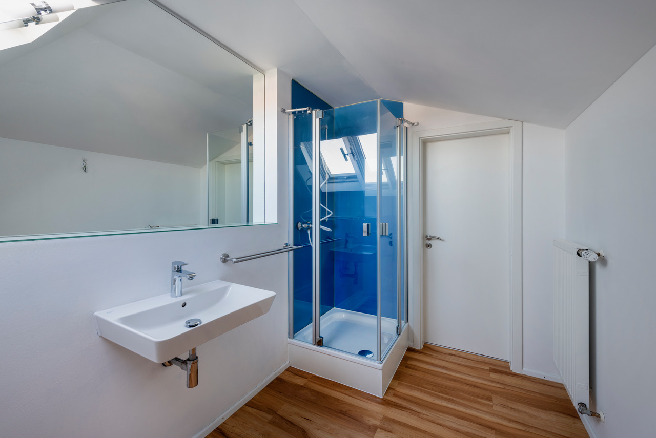 Das Herzstück bildet das 51 m² große Wohnzimmer mit Kaminofen in offener Bauweise. Hinzu kommt ein beeindruckendes Dachstudio mit rund 60 m², eigenem Bad und exklusiven Schreinereinbauten – nahezu eine eigenständige Wohneinheit mit vielfältigen Nutzungsmöglichkeiten.