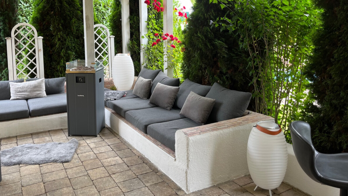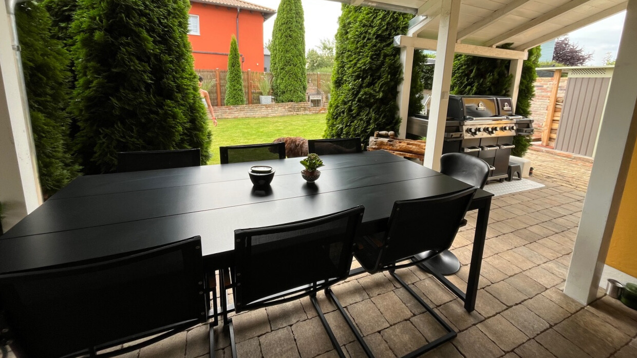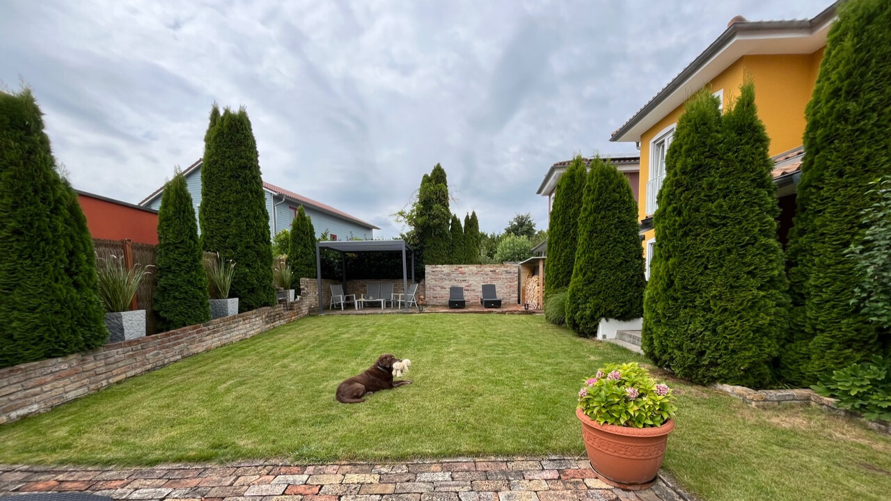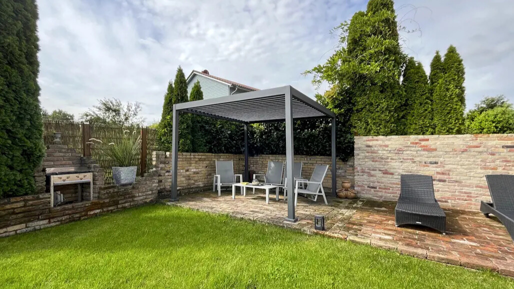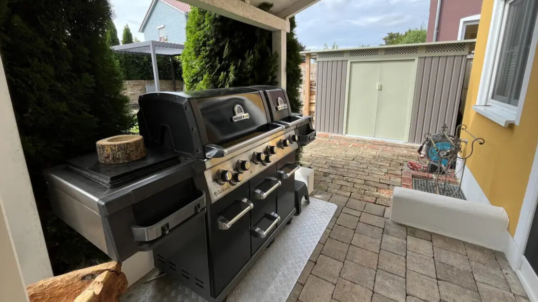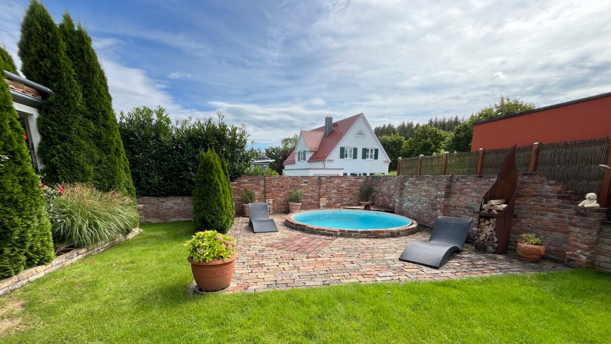 Im Garten findet sich ein fest installierter Grill Bereich, eine Lounge Ecke sowie der Pool und ein weiteres Nebengebäude.