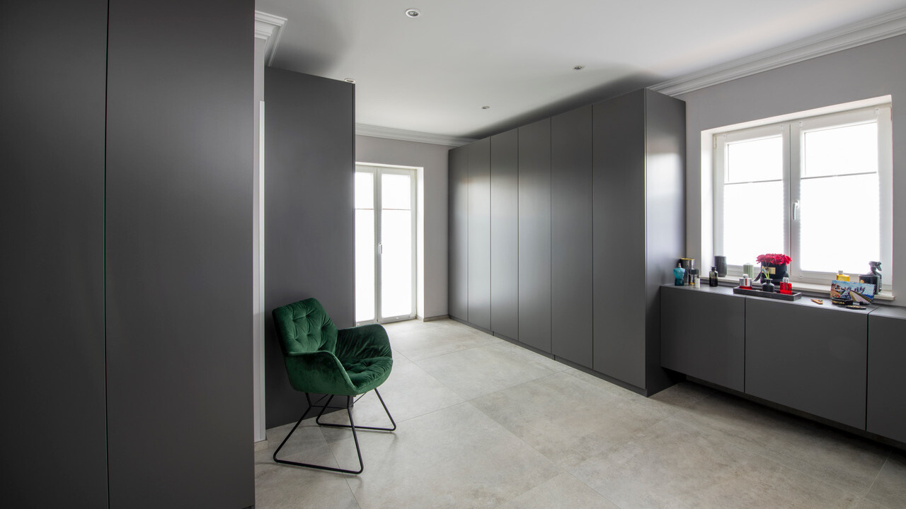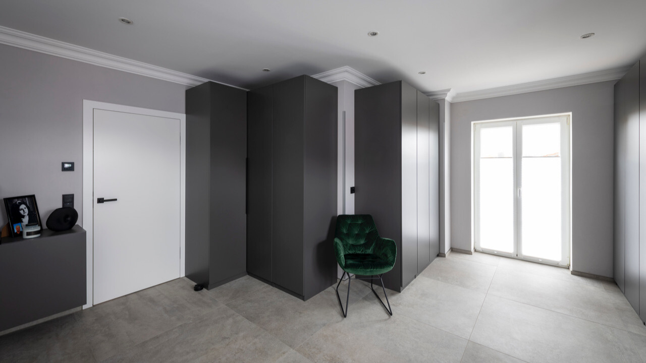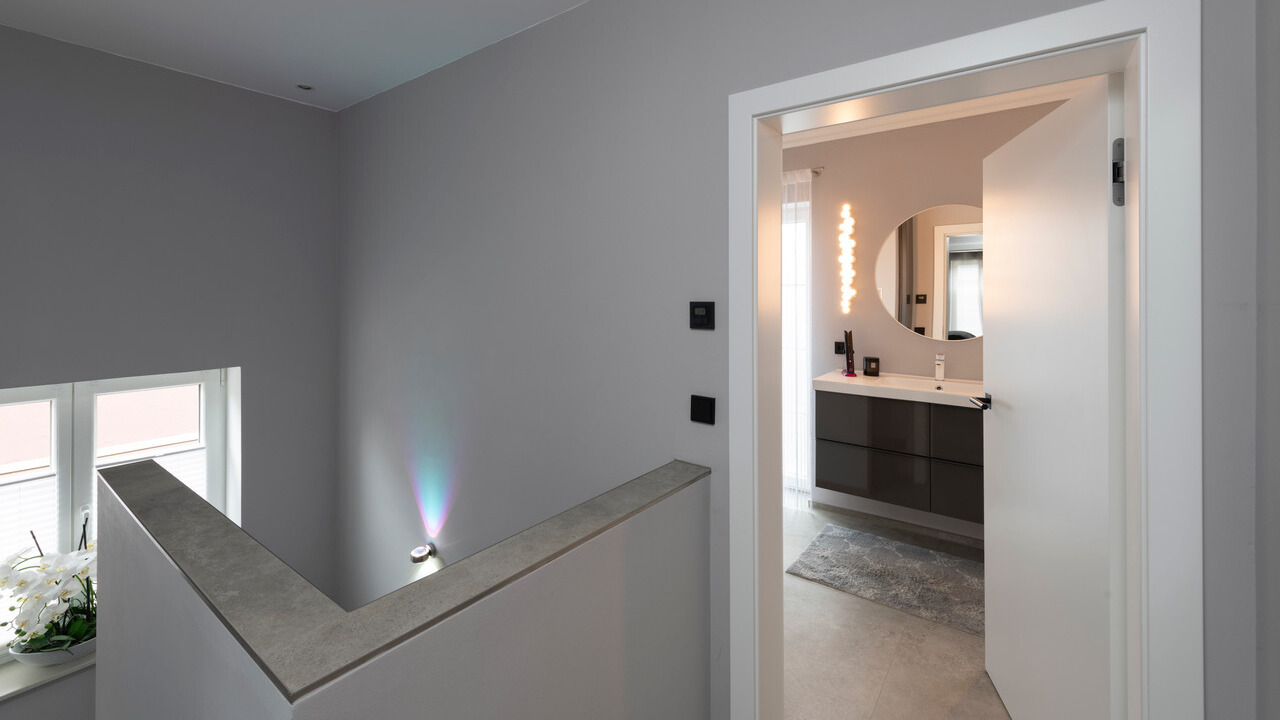 In der oberen Etage befinden sich Schlafräume, eine sehr großzügige Ankleide (komplett eingerichtet) sowie das neu gestaltete Bad, akzentuiert mit architektonisch minimalistischen weissen Türen. Das moderne Farbkonzept zieht sich konsequent durch, wodurch die Räume großzügig wirken. Sämtliche Türen haben hochwertige inliegende Türbänder.