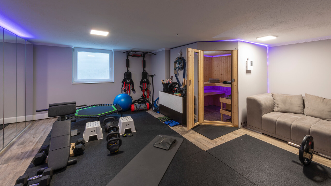 Das Fitness Studio im UG sowie weitere Kellerräume haben große Fensteranlagen, was dem Raum ebenso ein gutes Wohngefühl verleiht.