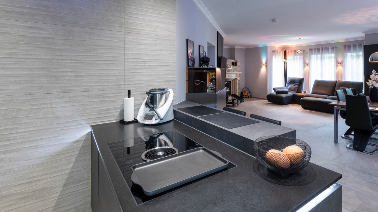 Im Eingangsgeschoss findet sich ein elegantes Entre, das in den offenen Wohn-Kochbereich übergeht.  Eine supermoderne Küche mit Doppelbackofen, Stein Arbeitsplatte, Dampfgarer usw. lädt zum gemeinsamen Kochen ein.  Alle Geräte sind von Markenherstellern wie Bora etc.