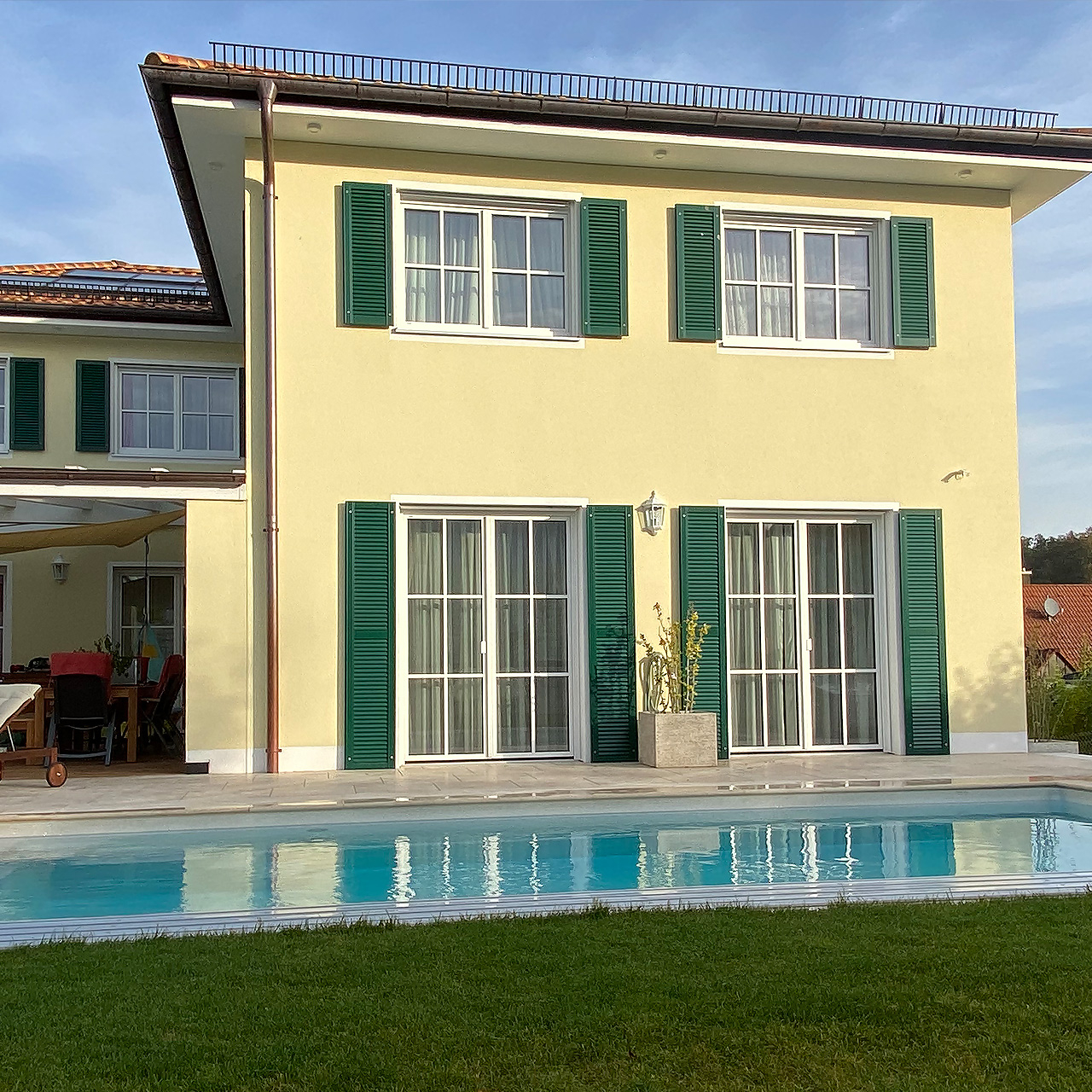 Dieses repräsentative Anwesen erinnert an ein Lebensgefühl Italiens oder Frankreichs. Auf 1000 qm Grundstück mit Pool und fest installierter Outdoor Küche kann man sich auf die Wochenenden freuen. Nicht weniger beeindruckend ist das Interieur mit 2,85 m Deckenhöhe und einem kunstvoll geplantem Sichtdachstuhl .
